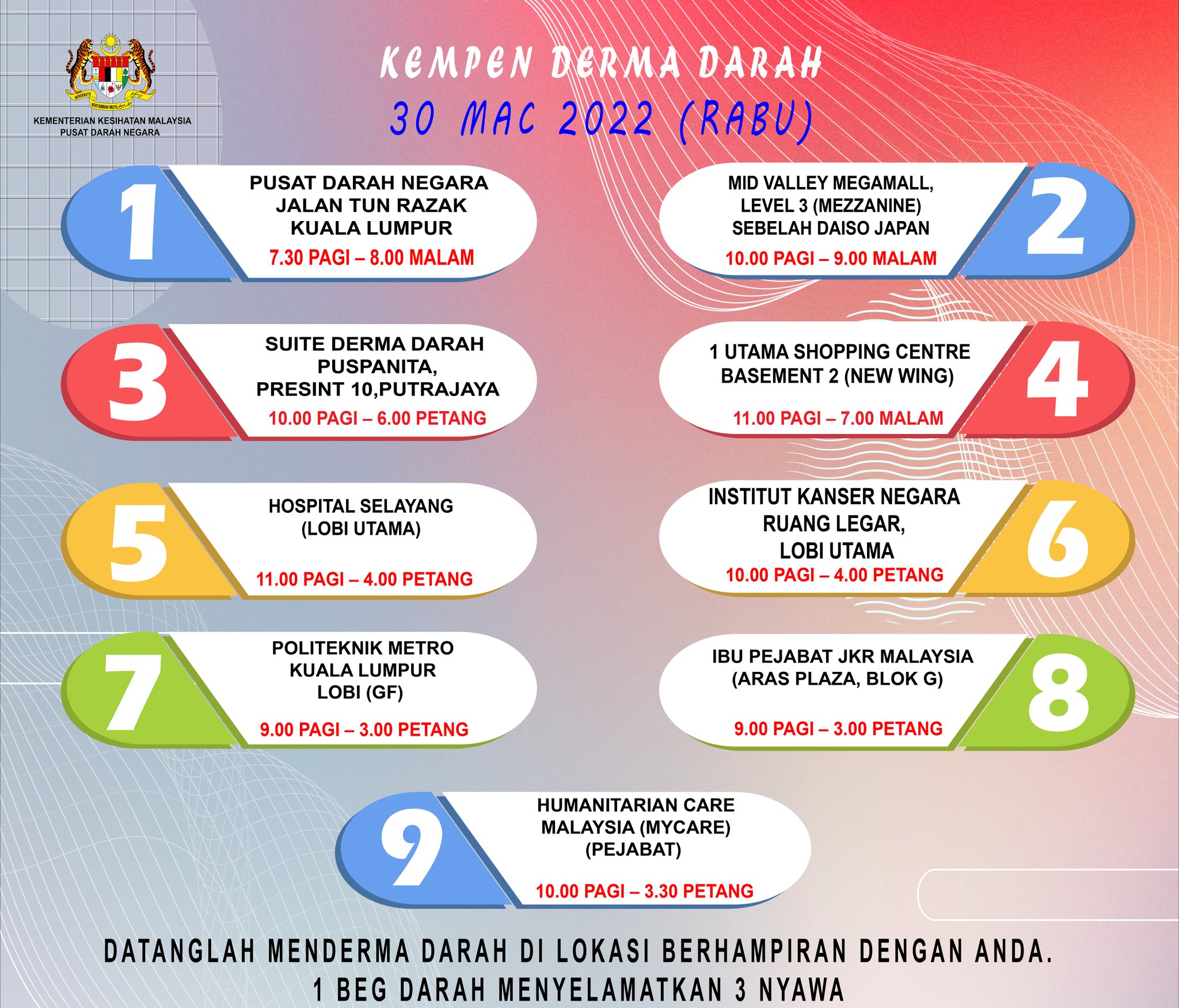 Pusatdarahnegara On Twitter Berikut Merupakan Jadual Kempen Derma Darah Pada 30 Mac 2022 Rabu Kepada Mereka Yang Berkelapangan Hadirlah Menderma Darah Di Lokasi Yang Berhampiran Https T Co Kubt2uuvsu Twitter